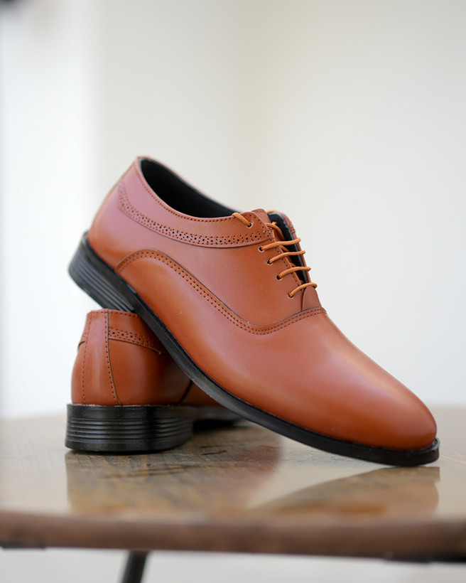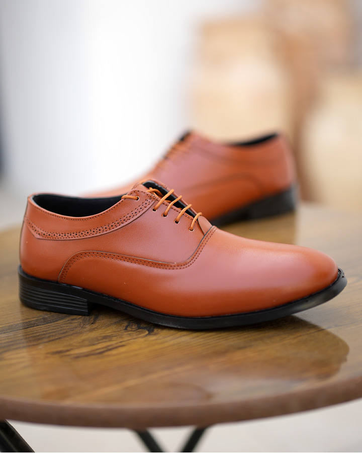 کفش مردانه مجلسی قهوهای، رویه چرم مصنوعی باکیفیت، زیره PVC، سایز ۴۰ تا ۴۴، شیک و مقاوم برای مجالس و استفاده روزانه.